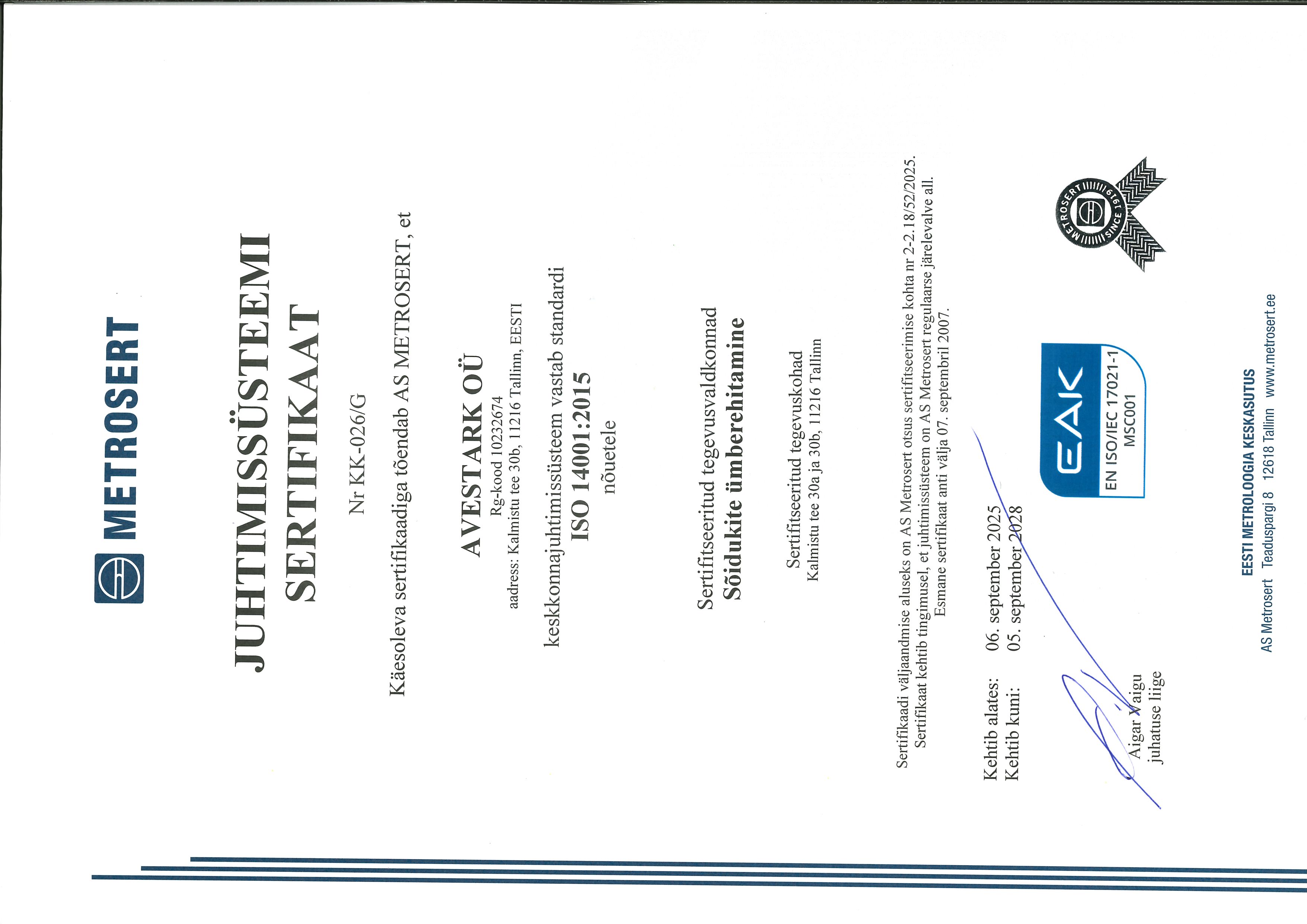 Alates 15.06.2018 alustas Avestark OÜ üleminekut standarditele ISO 9001 : 2015 ja ISO 14001 : 2015, mis kehtivad kuni 05.09.2028.