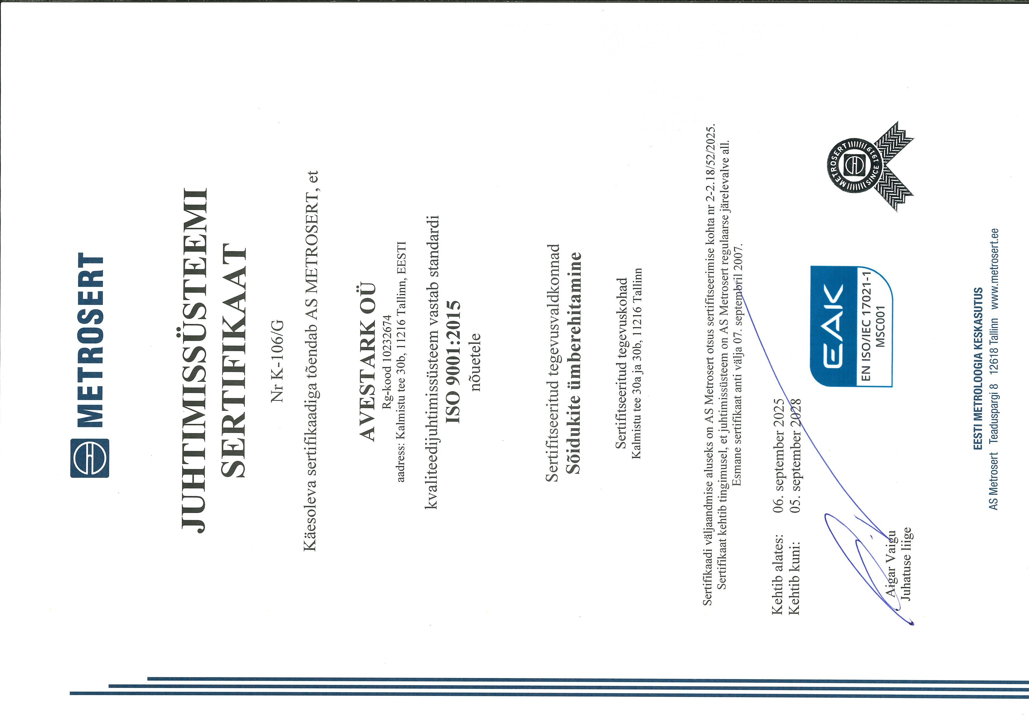 Alates 15.06.2018 alustas Avestark OÜ üleminekut standarditele ISO 9001 : 2015 ja ISO 14001 : 2015, mis kehtivad kuni 05.09.2028.